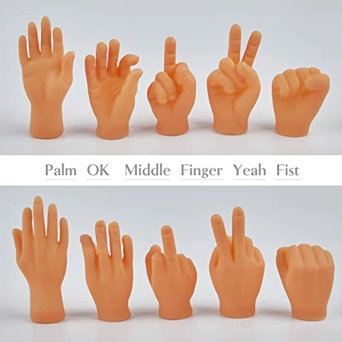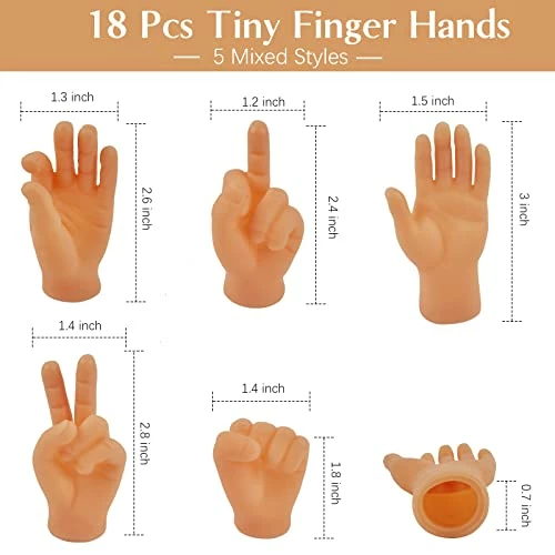 - Package Content: You will get 18 pcs tiny hands for fingers. 5 left hands, 5 right hands, 2 fist, 2 finger hands for victory, 2 ok finger hands and 2 middle finger gesture hands. A great value gift package allows you to have as much fun as you want.