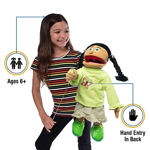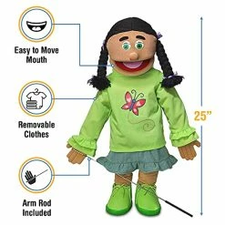 I was disappointed that the shirt that Jasmine was wearing was not the same as in the picture. I specifically ordered this puppet for programs that our agency does in the public schools. The shirt in the photo has a butterfly on it…the shirt she was wearing when she arrived said I love Christ (but in Spanish). Not what we had wanted. We had to go out and purchase a different shirt for her because we needed her for a program the day after she arrived. Disappointed with that, but the puppet is very good quality and arrived pretty quickly after I ordered.