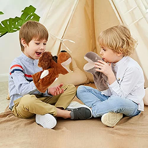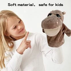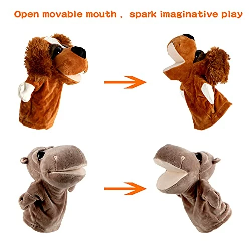 - Classic Animal Hand Puppets: 2 Animal Soft Hand Puppets with big heads- puppy & hippo. Each hand puppet has movable hands and big mouth, which can be opened and closed with your fingers inside the puppet, ideal for adults and kids.