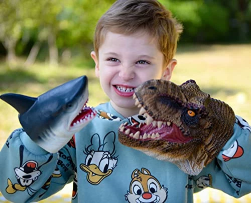 These 2 puppets are absolutely awesome! The dinosaur is much bigger than expected which makes it all the more cool! Fantastic features, quality and thick material but still flexible enough to manipulate the mouth. The shark is perfect in size, excellent quality and great features such as the teeth and eyes, mouth and fin. These are a hit out of the park and our 5 year grandson will love them!Highly recommend this brand!