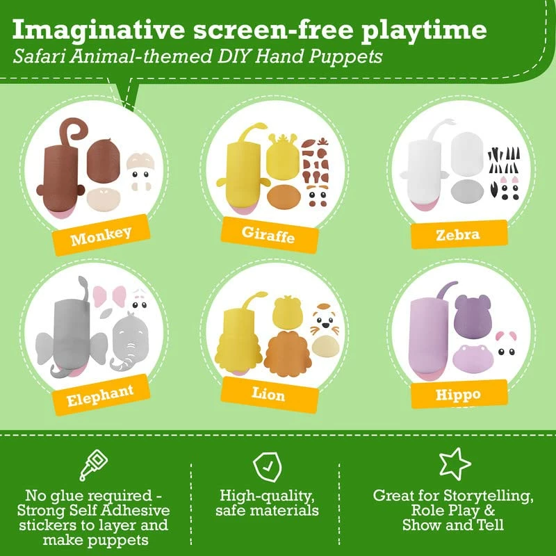 - PUPPET KIT LIKE NO OTHER: This felt puppet kit includes materials and instructions to make 6 animal puppets – Giraffe, Elephant, Hippo, Monkey, Lion, & Zebra. Perfect arts & crafts kit for storytelling.