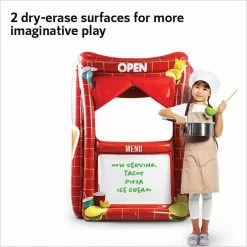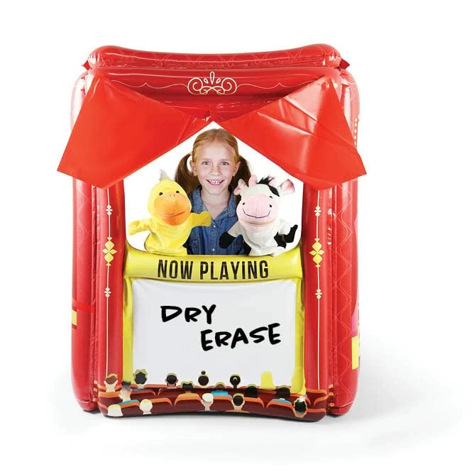 - Reversible – This plastic inflatable puppet stage is reversible and versatile, comes with curtain that can be buttoned up and a dry erase area on the side