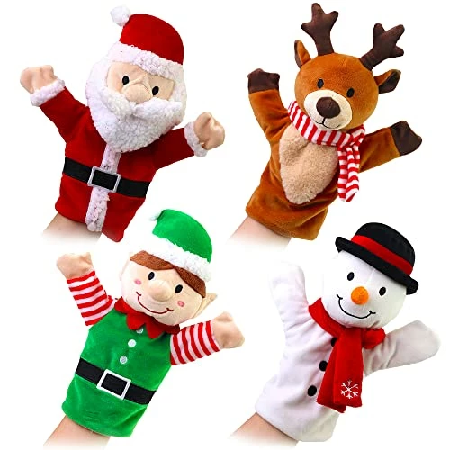 These puppets are so cute they will bring a smile to any ones face they are also great for imaginative play and role playing. You get 4 puppets and adults or children can bring them to life just put it on your hand . You get a snowman, a reindeer, an elf, and or course Santa Claus. These a well made there are a couple of seams that are bit off but not a big deal. Iβm planning to give these away to my grandkids they will have a blast with them even after Christmas. Very giftable your can give all 4 or give 4 people each a puppet. Great Puppets.