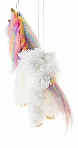 - Soft yarn body with rainbow mane and tail, wooden marionette bar and unicorn hooves