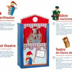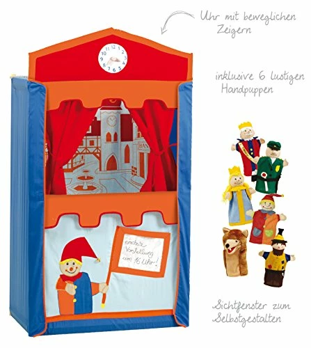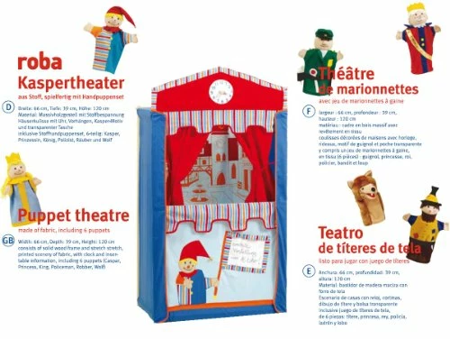 - Robaβs Wooden Puppet Theater includes 6 hand puppets, a clock with moveable hands, a slip pouch for event notices, curtains and a printed stage background with a city motif.